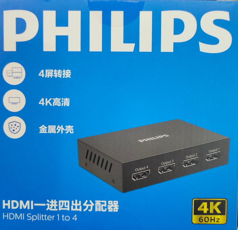 The PHILIPS SWR9101L/9 HDMI 4-Port Splitter efficiently distributes a single HDMI input to four displays simultaneously, maintaining high-definition signal quality. Ideal for professional setups, it supports seamless video and audio transmission, perfect for presentations, retail displays, or multi-room entertainment systems. Its robust design ensures stable connections and consistent performance across all outputs.