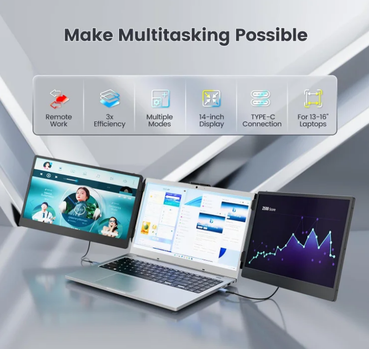 The portable triple monitor is designed for enhanced productivity, perfect for professionals and students on the go.